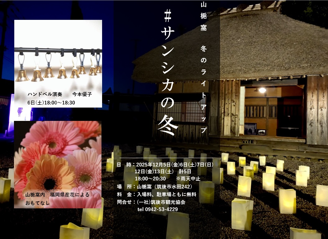 山梔窩(さんしか)で約10年を過ごした幕末の志士・真木保臣の遺徳を偲び、冬のライトアップを行います。今年は、山梔窩内での花のおもてなしや、今本優子によるハンドベル演奏(6日(土)18:00~18:30)を特別プログラムとして実施します。
