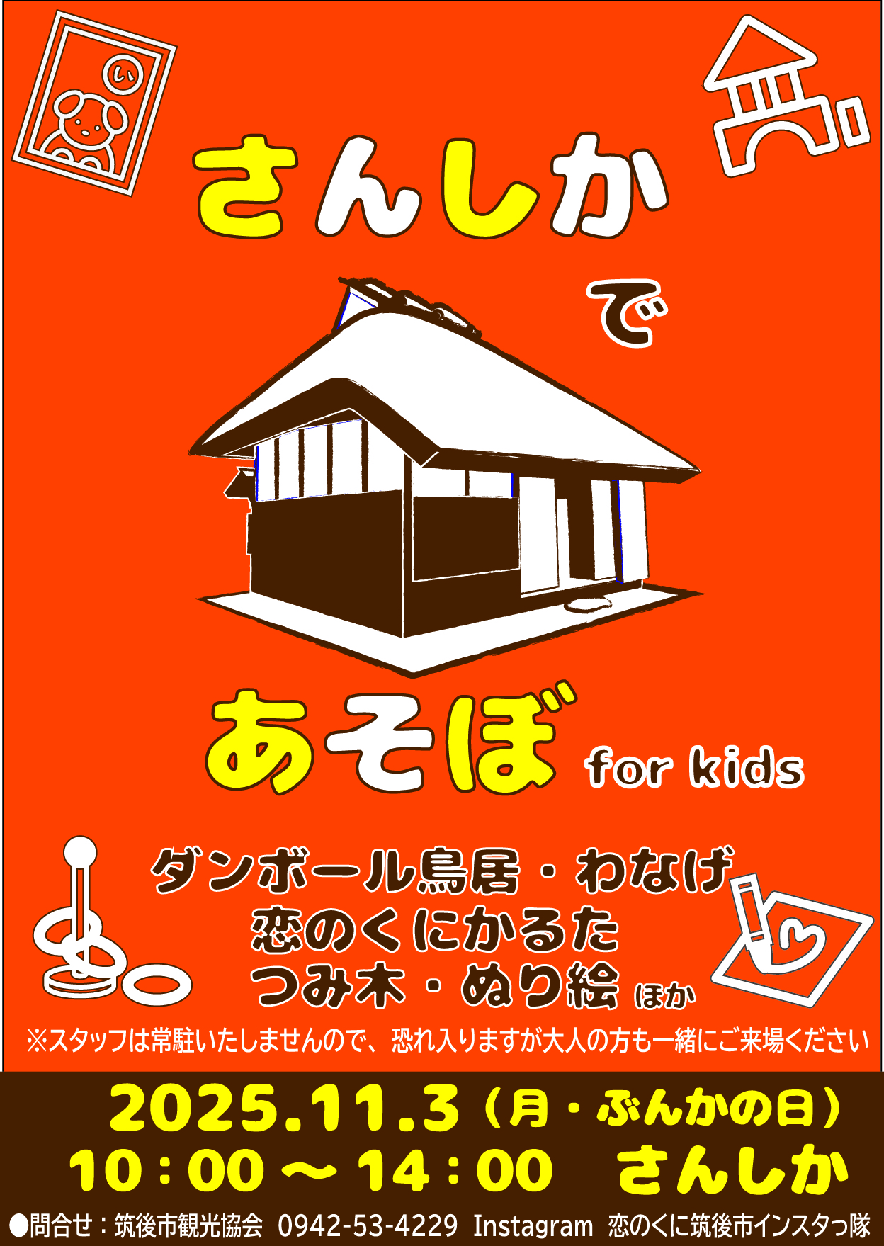 『九州ダンボール(株)』のダンボール製鳥居や輪投げ、筑後市内の観光スポットや行事が登場する『恋のくにかるた』、『(株)コスモ』の積み木や、筑後市PRキャラクターはね丸・パネコ・ポネコのぬり絵など、県指定文化財「山梔窩」が楽しく遊べるスペースに♪