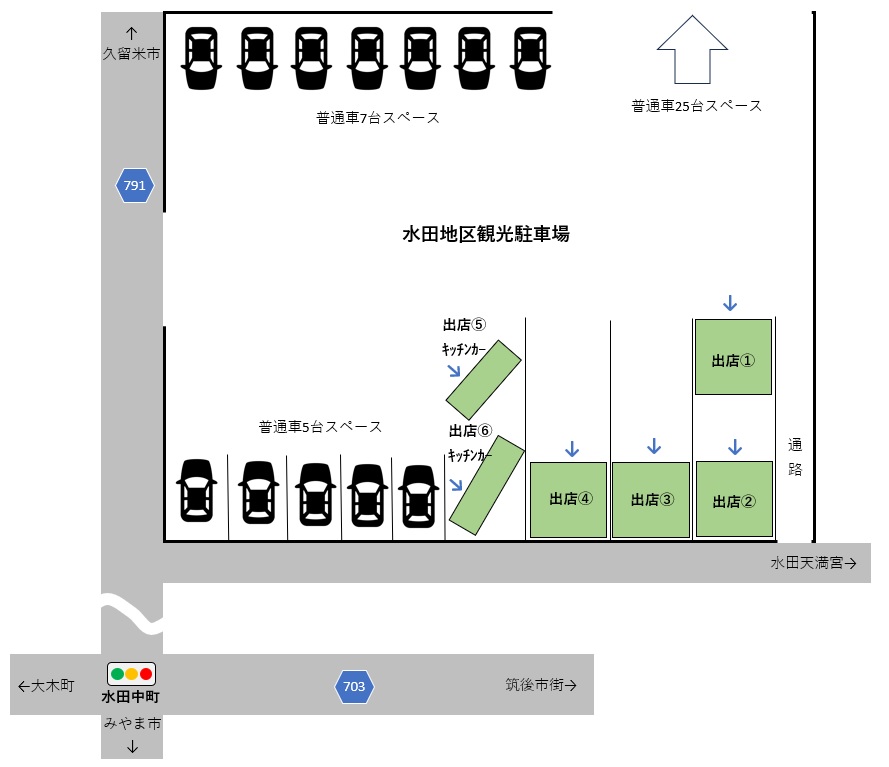 SANSHIKA新春パサール2026 ツイート シェア 学問の神様・水田天満宮と良縁の神様・恋木神社は、毎年多くの初詣客で賑わいます。その駐車場のひとつ「水田地区観光駐車場」では、6つのお店が美味しいものを持ち寄ります。ぜひお立ち寄りください!(※パサールとはドライブ時の立寄り所PA・SAを組み合わせて作られた言葉で、スペイン語でも「立寄り」の意味がある言葉です。) -会場レイアウト- -出店者リスト- ★2026年1月1日(祝)10:00~17:00 ①スイーツナカムラ(久留米市、シフォンケーキ・クッキー・焼菓子) ②くりの木(筑後市、マフィン福袋・ホットレモン) ③鵲珈琲(筑後市、コーヒー・ラテ・紅茶・珈琲豆) ④FreshCandy(佐賀市、フルーツ飴) ⑤焼きとり寅さん(みやま市、焼き鳥・焼きそば・とうもろこし) ⑥ローズプランニング(武雄市、ロングポテト・さつま芋チップス・イカ焼き) ★2026年1月2日(金)10:00~17:00 ①キャトルフィーユ(筑後市、クッキー・米粉シフォンケーキ) ②くりの木(筑後市、マフィン福袋・ホットレモン) ③Baji Cafe(筑後市、ポップコーン・オニオンスープ) ④FreshCandy(佐賀市、フルーツ飴) ⑤焼きとり寅さん(みやま市、焼き鳥・焼きそば・とうもろこし) ⑥ローズプランニング(武雄市、ロングポテト・さつま芋チップス・イカ焼き) -その他- ・天候により中止や変更となる場合があります。ご了承ください。 -主催・問合せ- (一社)筑後市観光協会 TEL0942-53-4229 (12/29~31は休み)